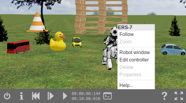 The console window displays all the simulation information, warning and error messages. These messages could come from the simulation core or from the robot controller. In fact, it also displays all the messages printed to the standard output (stdout) and standard error stderr from the robot controller, i.e. for example using the print statement in Python. The console can be open by clicking on the tool bar Console button. Keep an eye on the console if the simulation does not work as expected!